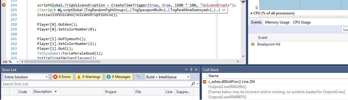 Since we do not have access to the Outpost 2 source code or program debug database (PDB file), we cannot step through the Outpost 2 executable code or compare the stack trace with source code. However, we can still debug custom scenario DLLs.