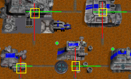 For buildings in Outpost 2 that span more than one tile, the position is determined by the point where the vertical and horizontal tube of a building would intercept if they were continuous. See the graphic below for a visual representation. For a building without tube connections, like a Tokamak, the LOCATION of the building corresponds with the lower right tile of the structure.
