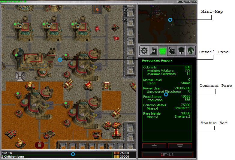 The Command Pane shows information about, and issues commands to, all of your structures and vehicles.