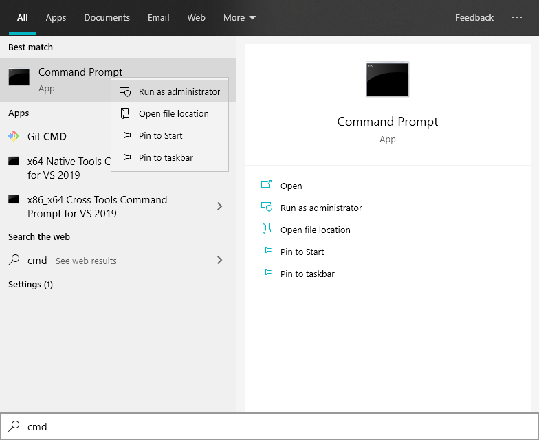 To begin, open a command prompt with administrator privileges. Click on the start button and type in cmd