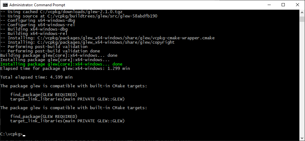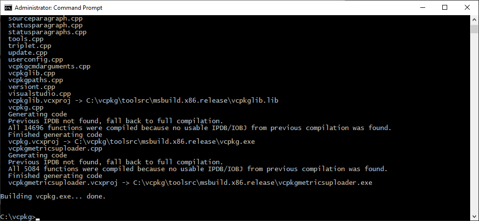 . It will take a few minutes for vcpkg to builds itself. After it finishes your prompt should look like this: